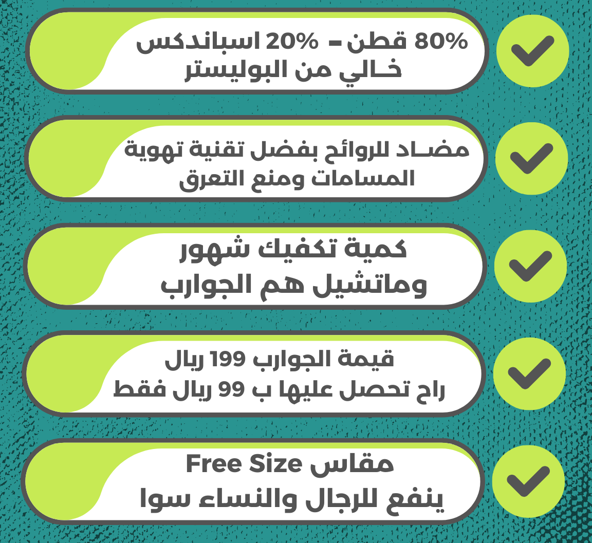 بإتمامك للطلب نضمن لك ان الشرابات جودة عالية ومضادة للروائح الكريهة وتم تصنيعها واستيرادها خصيصا وبمواصفات خاصة.